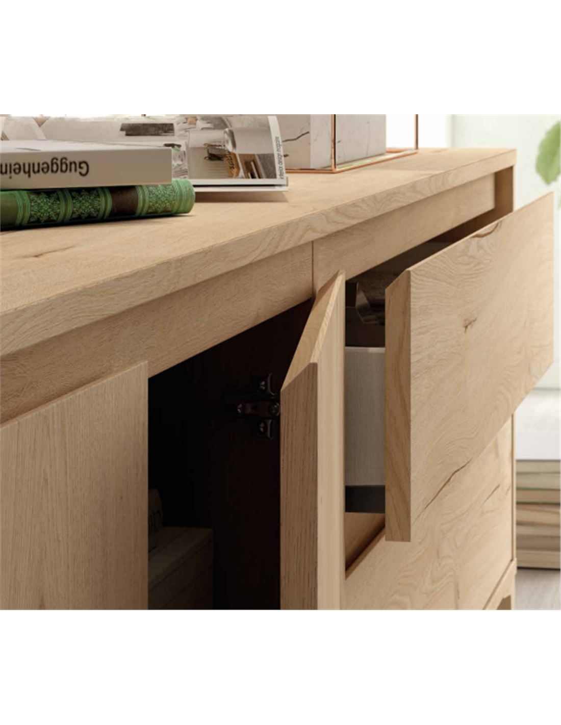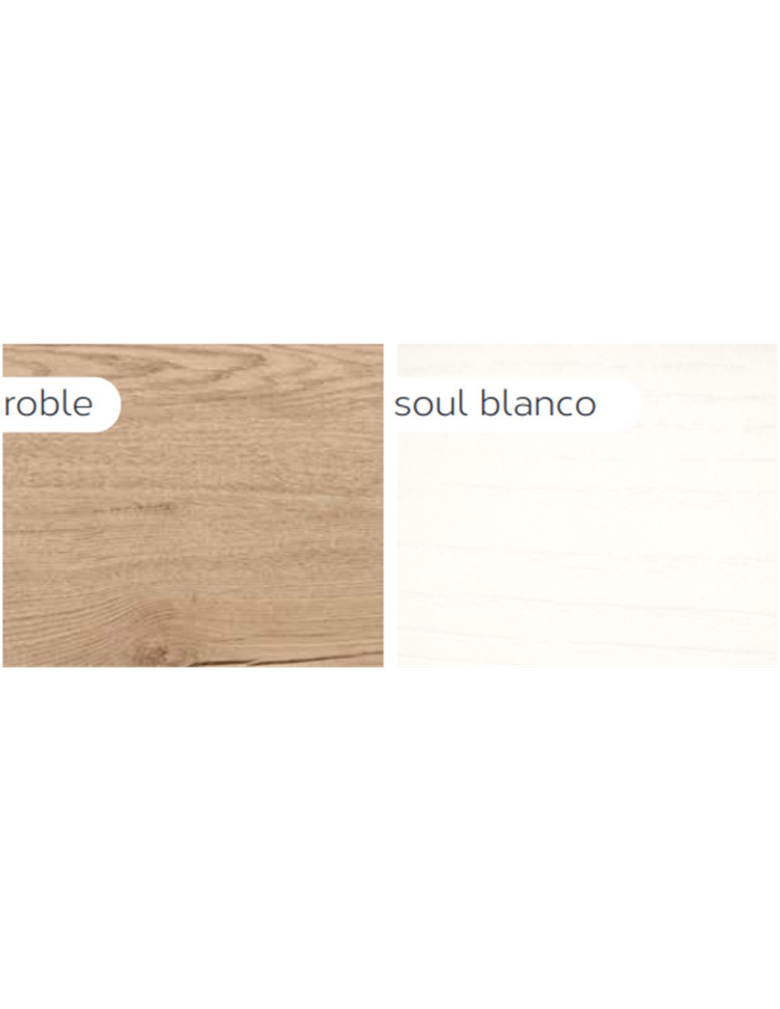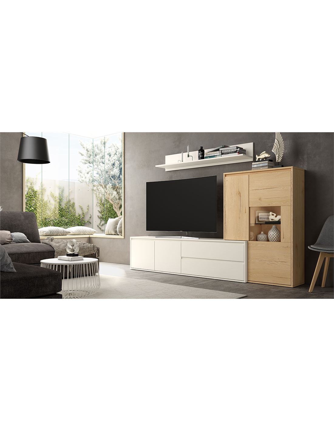 Composición modular, de estilo moderno en color soul blanco/roble. Este mueble está formado un módulo bajo, un módulo terminal derecho y una estantería, creando un ambiente en tu salón muy luminoso gracias a su estética y contraste de sus acabados, aportando elegancia y un diseño moderno a la estancia.
