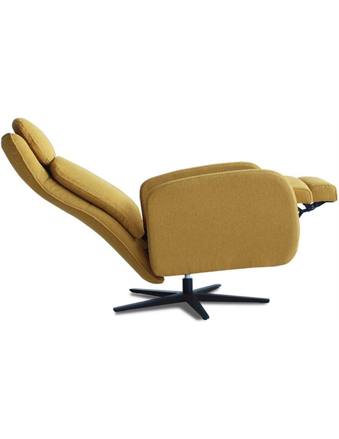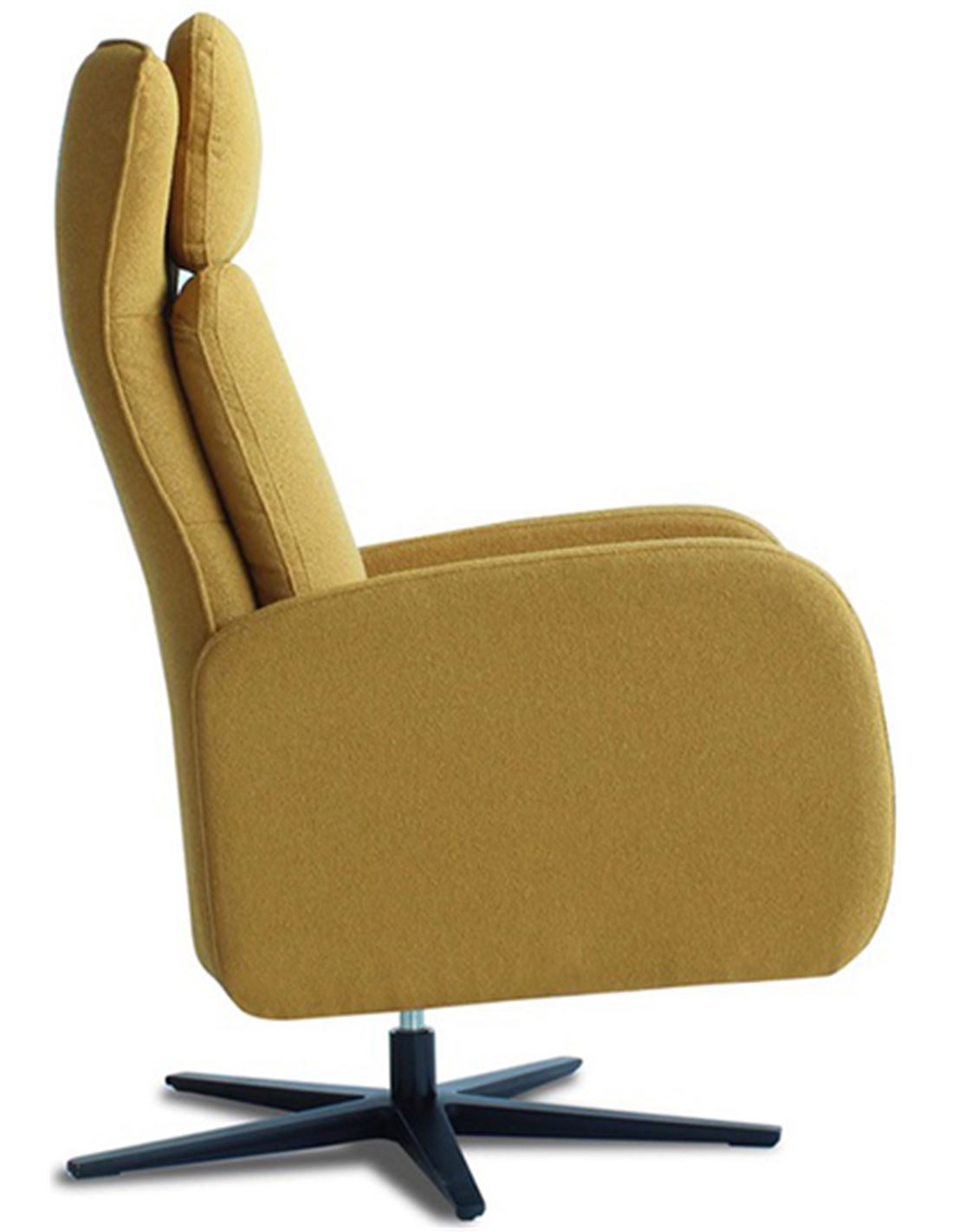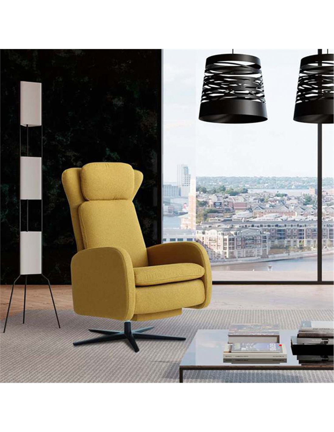 Sillón muy versátil con sistema relax de gran confort. Cuenta con una estructura metálica, almohada de espuma de poliuretano, respaldos de Viscoelástica recubierta de fibra de poliéster. Pie giratorio de acero.